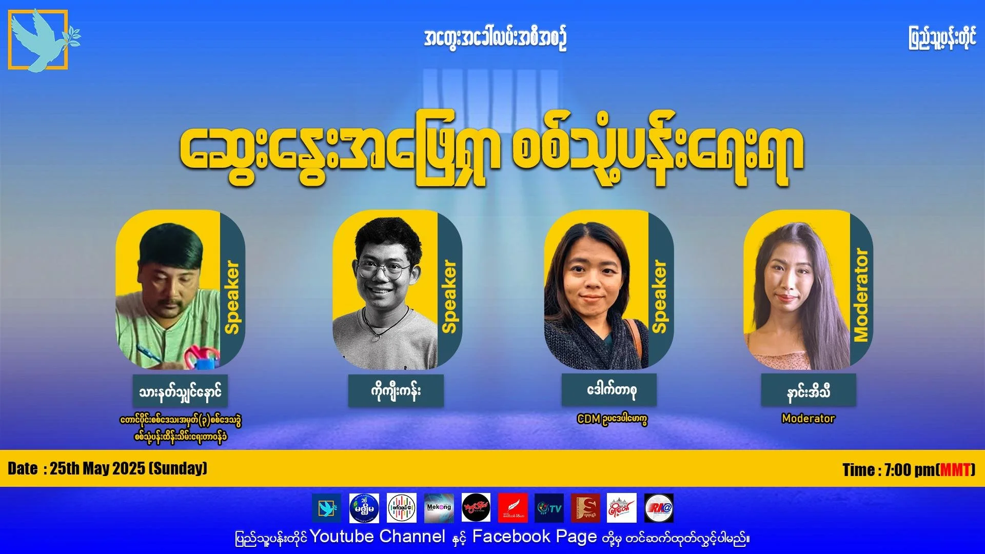 Speakers - Thar Nat Shin Naung (Officer in charge of prisoner of war detention, Southern Military Command, Sub-Region 3), Ko Kyee Kan (Ex PDF), Dr. Su (CDM Professor)