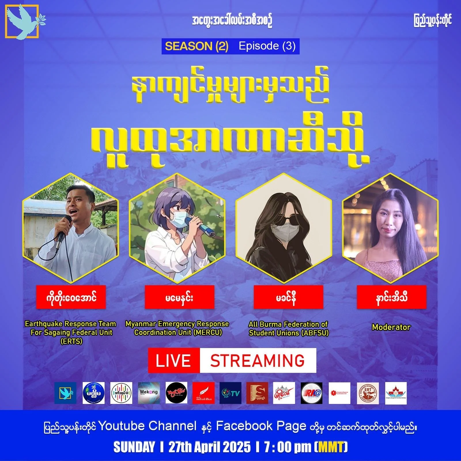 Speakers - Toe Wai Aung (Earthquake Response Team for Sagaing Federal Unit, ERTS), May Hnin (Myanmar Emergency Response Coordination Unit (MERCU), Khin Ni (All Burma Federation of Student Unions, ABFSU)